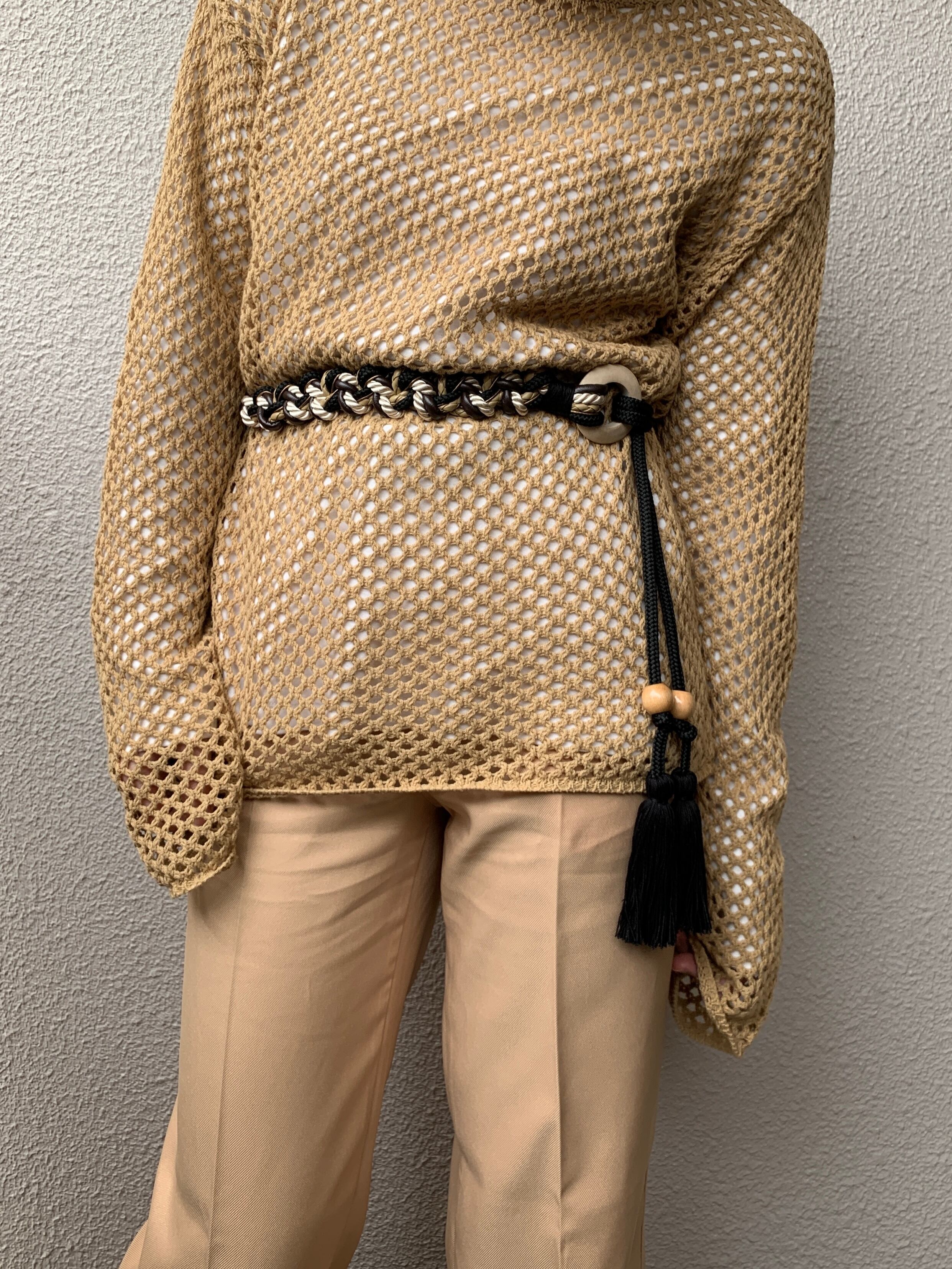 リアルレザーやシルクなど、多様な紐を1本1本編んで作ったハンドメイドの紐ベルト。