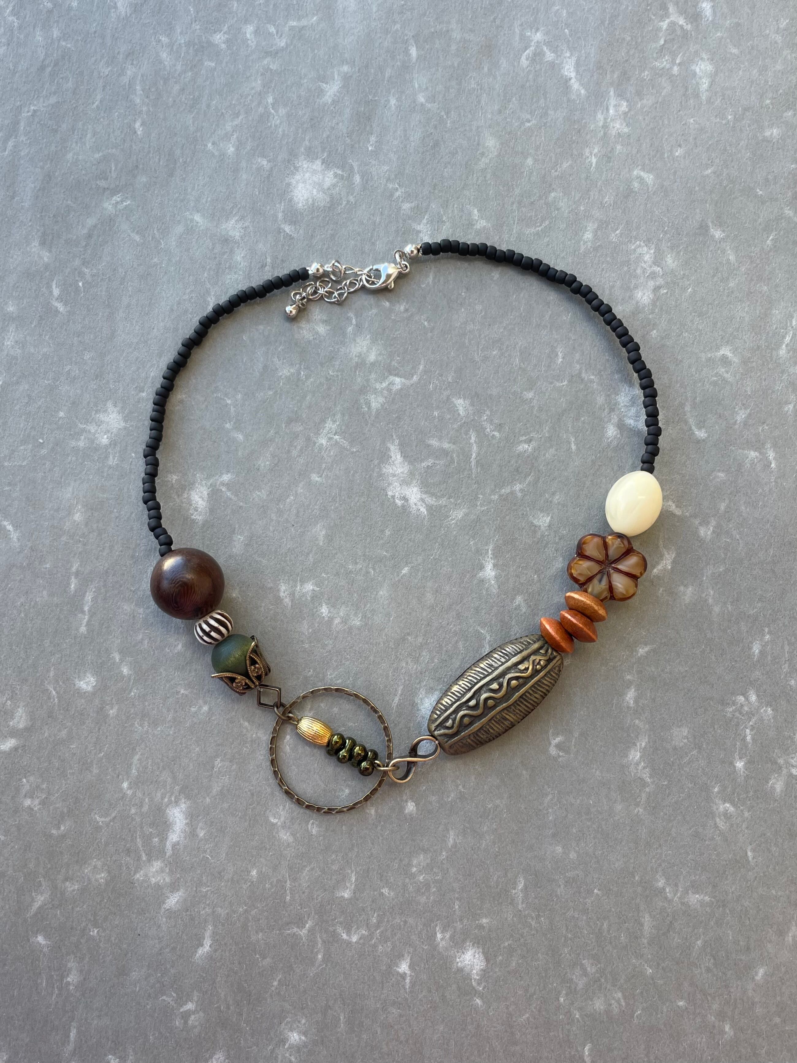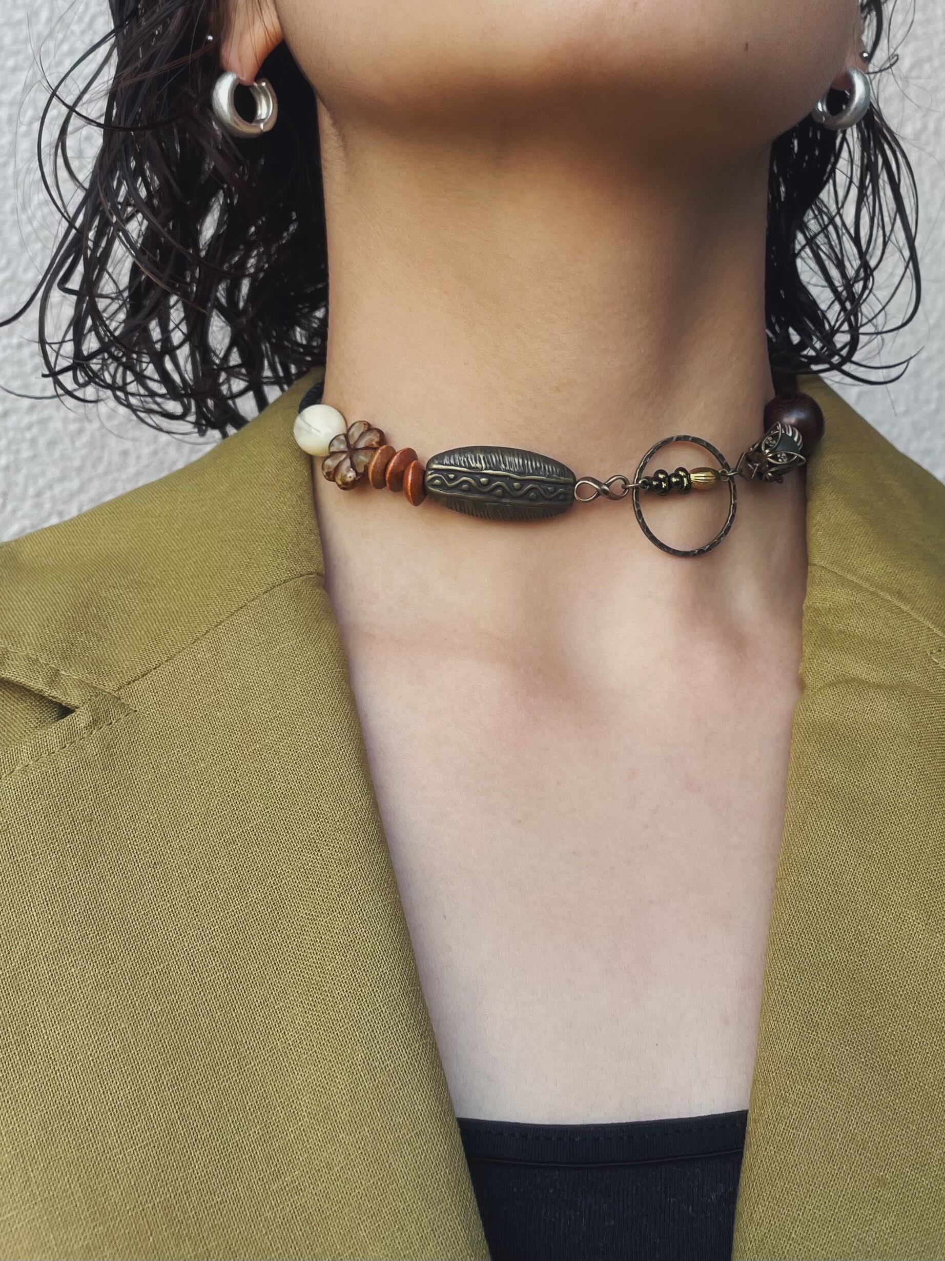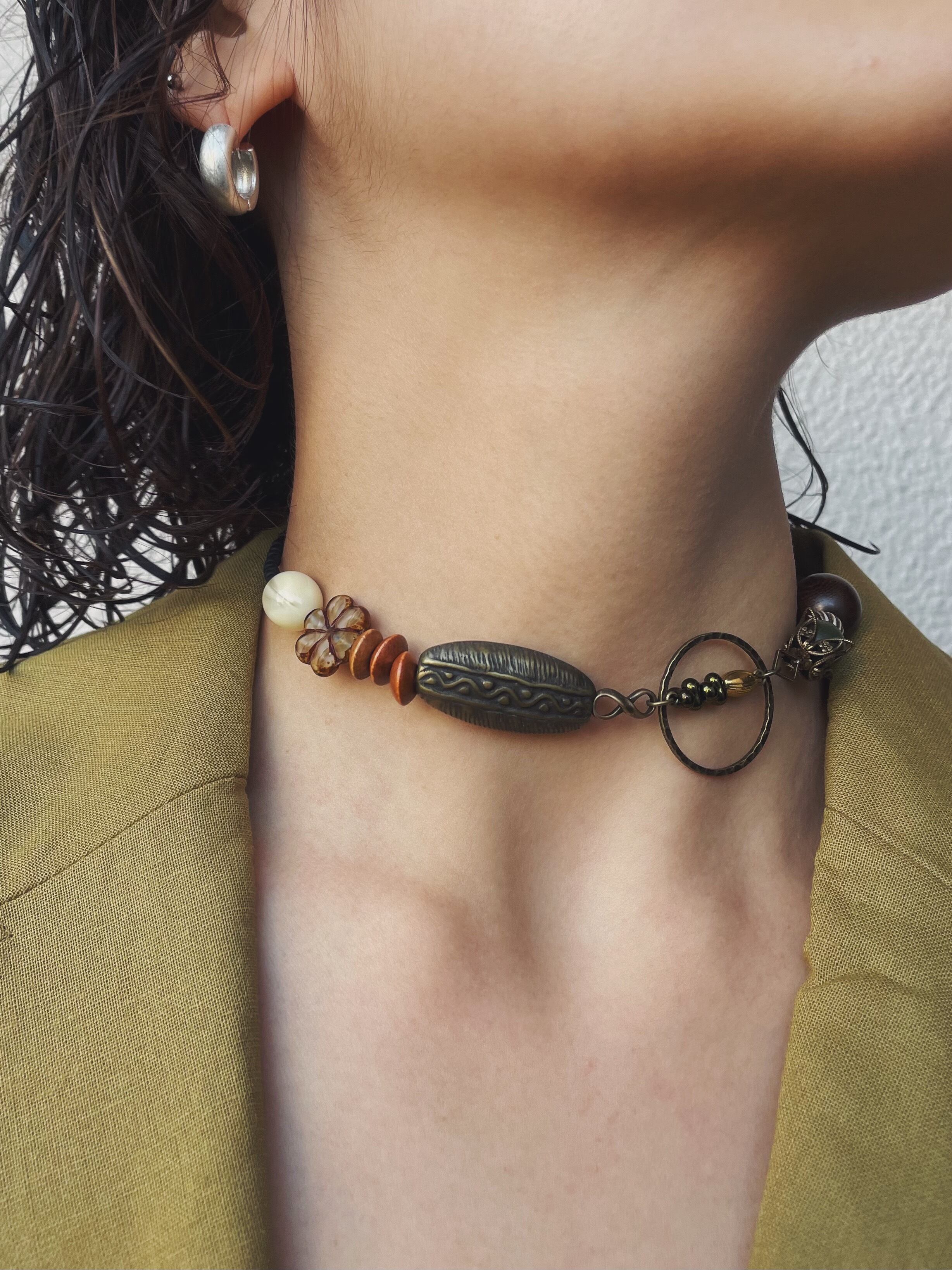 "気まぐれ"をテーマに国内外で仕入れた個性的なヴィンテージパーツをひとつひとつ組み合わせてショートネックレスを作りました。