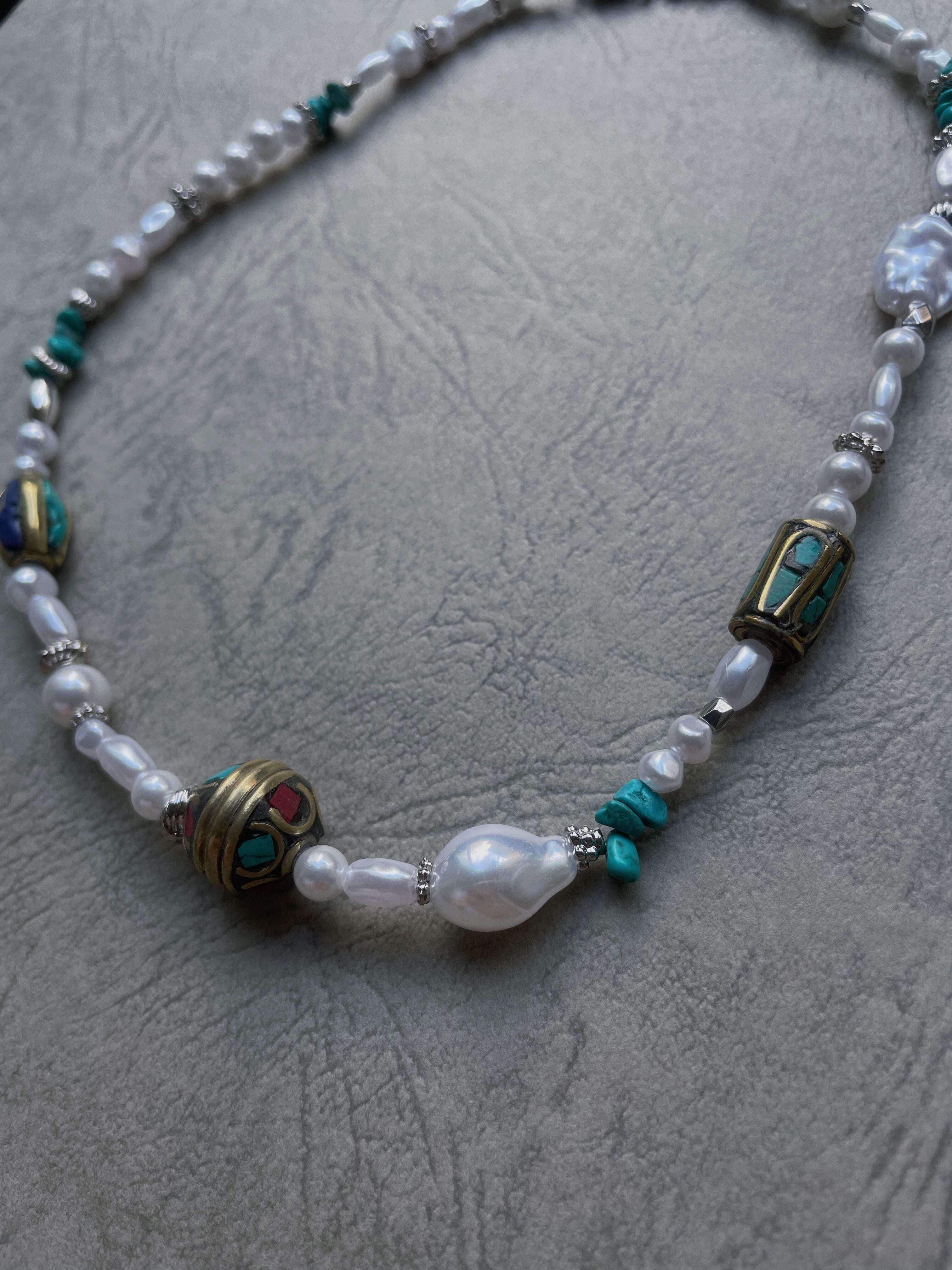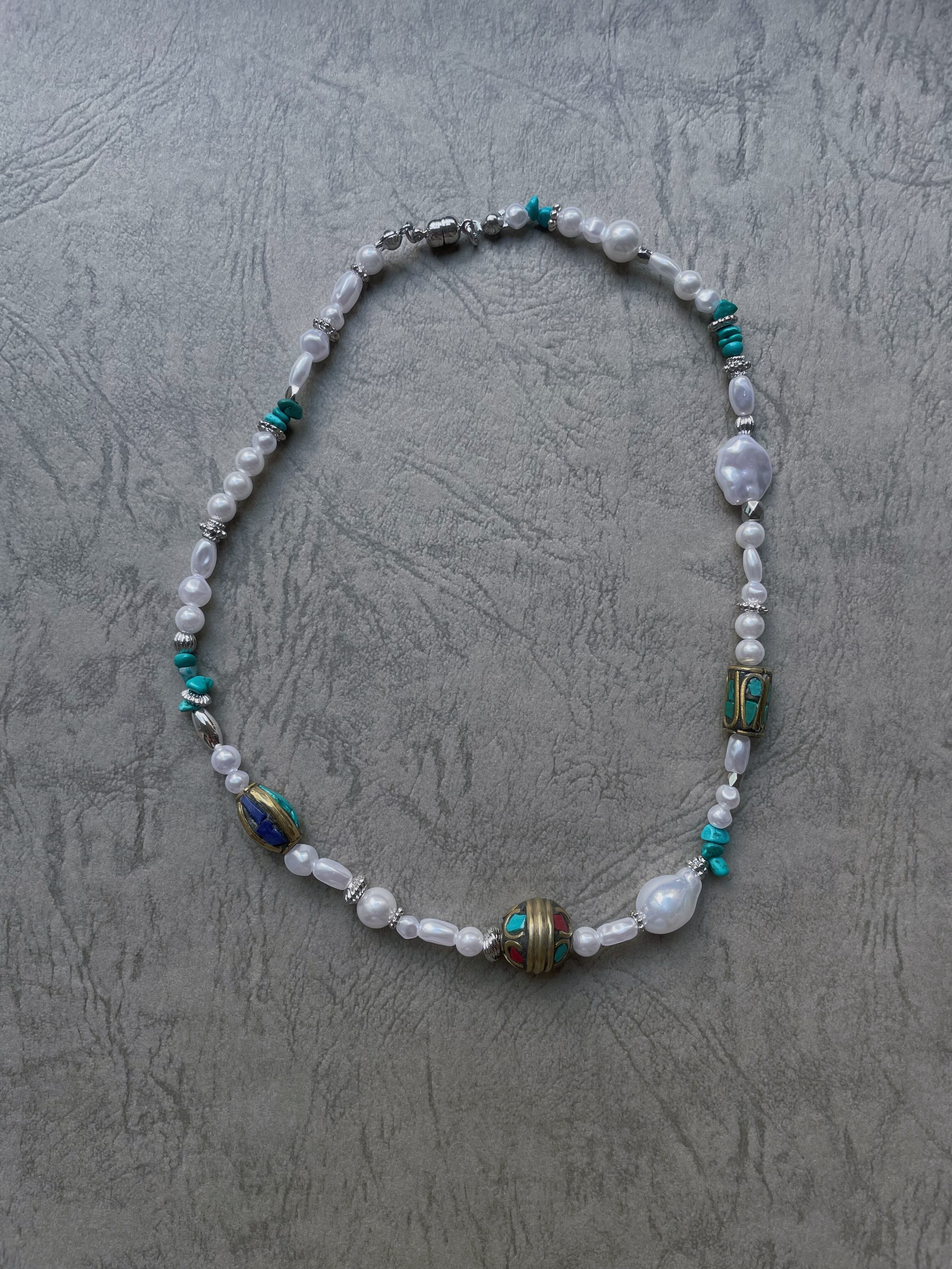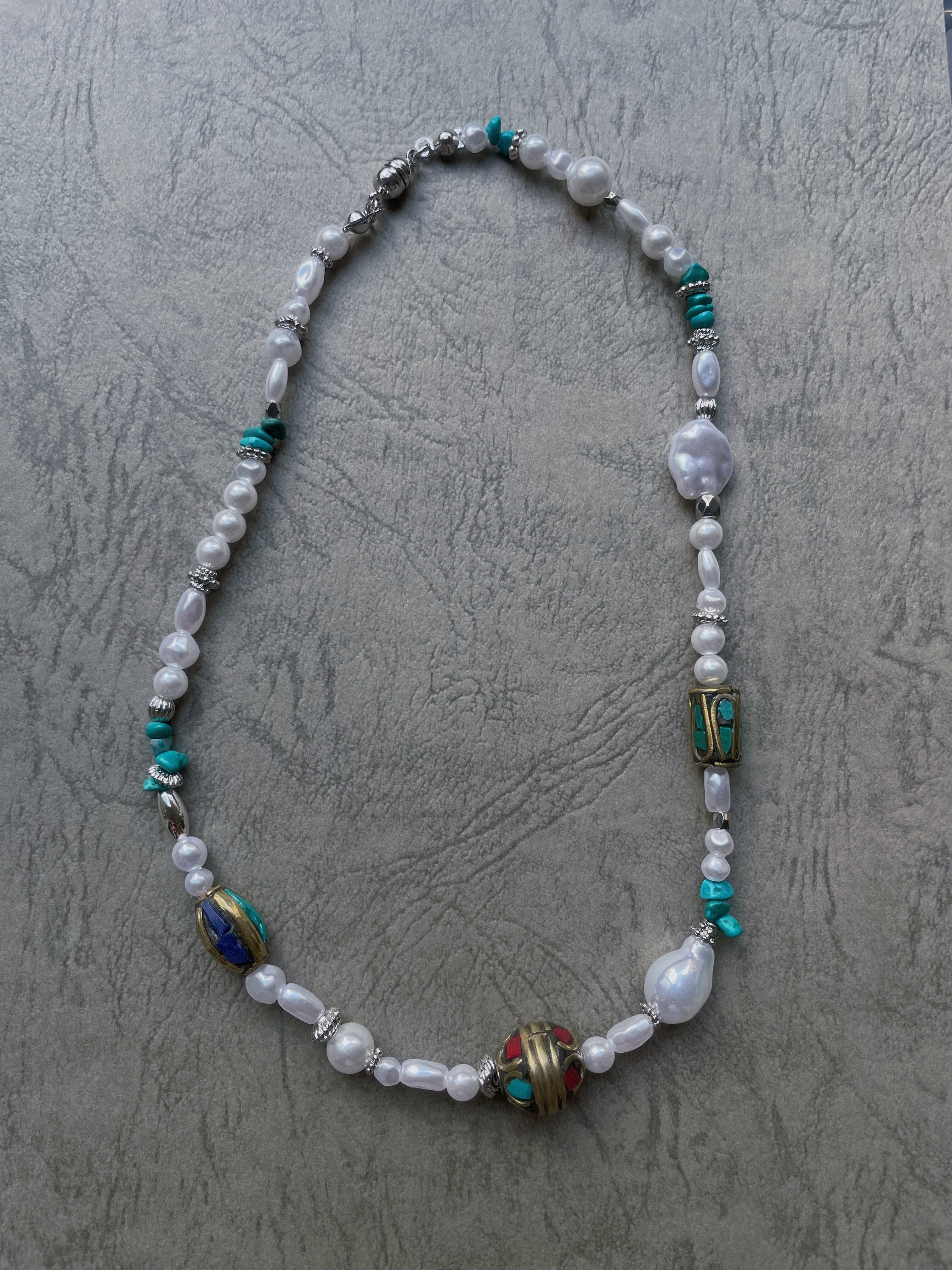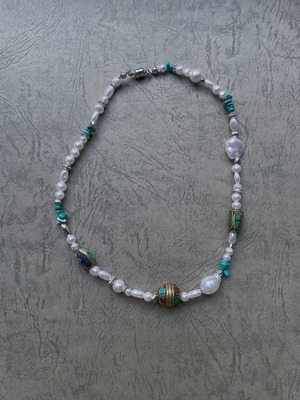 天然石と樹脂パールをミックスさせたショートネックラスです。