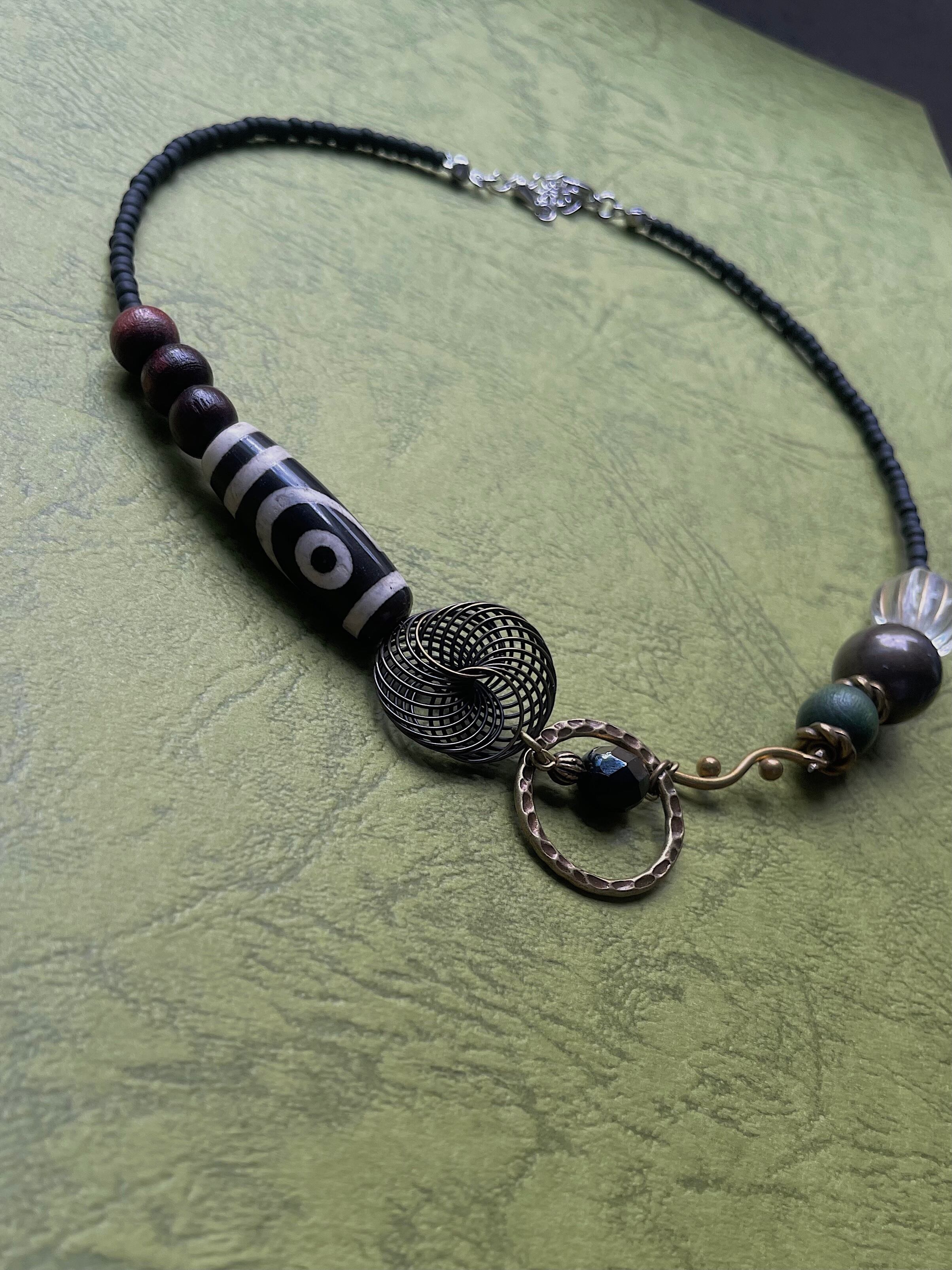"気まぐれ"をテーマに国内外で仕入れた個性的なヴィンテージパーツをひとつひとつ組み合わせてショートネックレスを作りました。