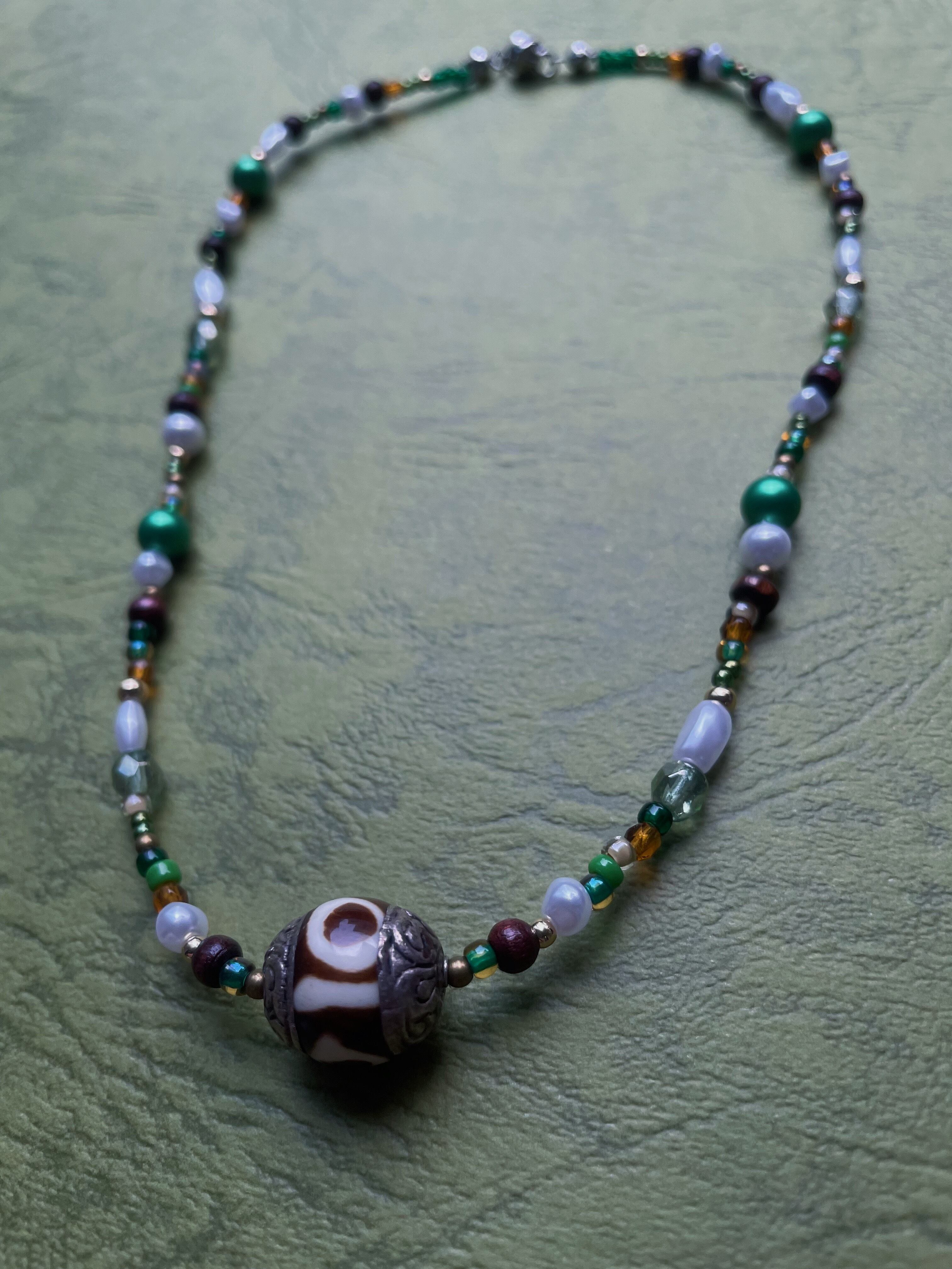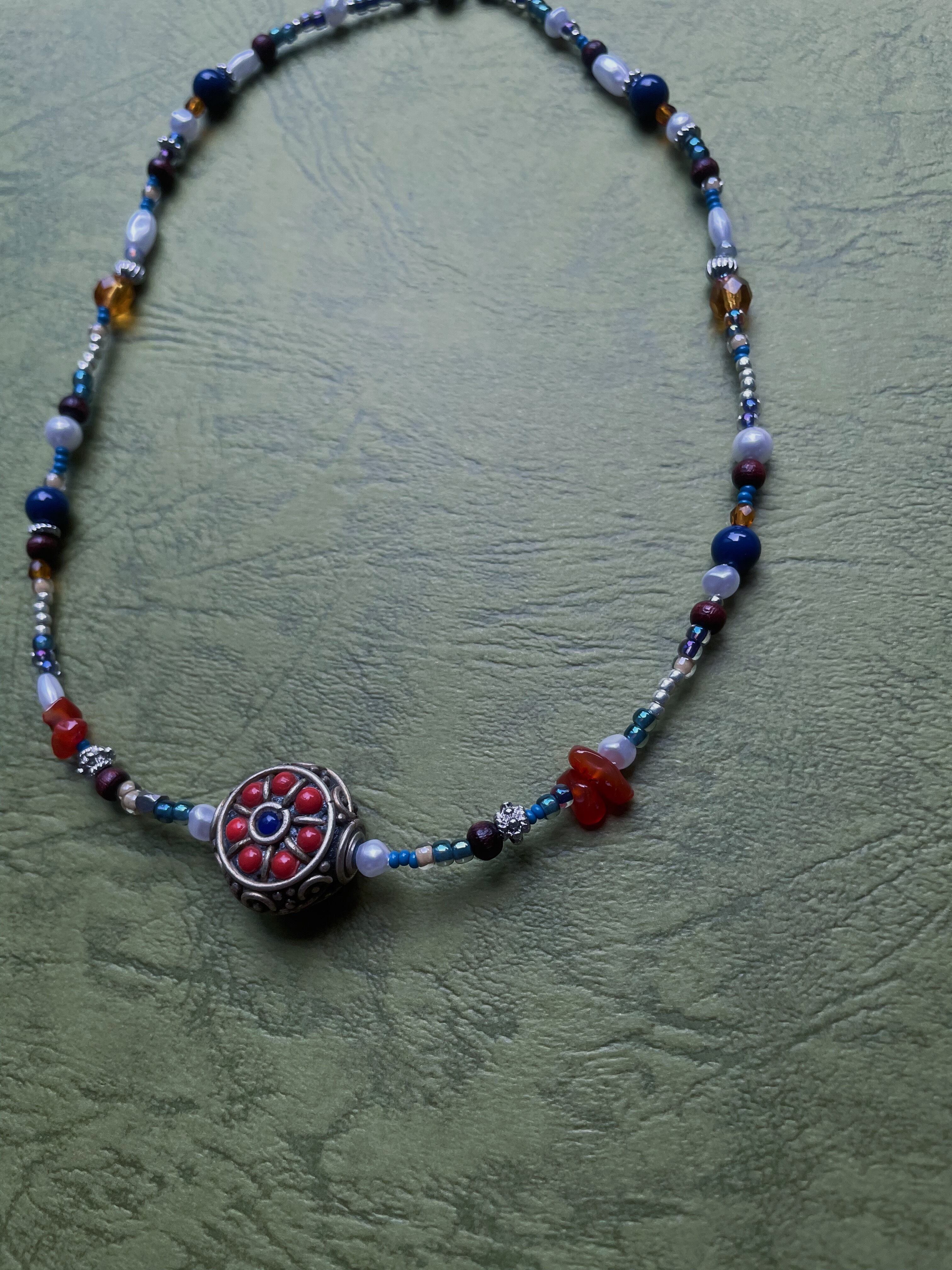 トップにはチベットビーズを使用しており、鮮やかな色合いに合わせてビーズを組み合わせたネックレスです。